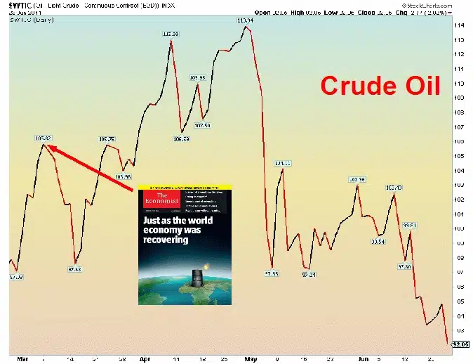 Wanneer media berichten over zaken als de stijging van de olieprijs, zie je op een gegeven moment een piek ontstaan in de aandacht rondom die stijging. Dat kan bijvoorbeeld zijn doordat het journaal met dit onderwerp opent. Een andere mogelijkheid, zoals ontwikkeld door Paul Montgomery is het principe van de “magazine coverindicator”. Aan de hand van de covers van magazines zoals Time, Newsweek, Businessweek en vooral The Economist doet Montgomery voorspellingen over bepaalde trends. Het idee daarbij is dat cover fungeert als een contraire indicator. In de terminologie van Socionomics heet dit: “the trend is mature”, ofwel de trend is rijp. Nieuws volgt de trend van een beurs of in dit geval van olie. Wanneer de trend op z’n einde loopt, zullen de media daar maximale aandacht aan besteden. In dit geval door middel van de cover van een magazine. The Economist maakt op donderdag bekend hoe het magazine van zaterdag eruit ziet. We zien in de afbeelding een olievat op de wereldbol, waarbij het lont van het olievat is aangestoken.”