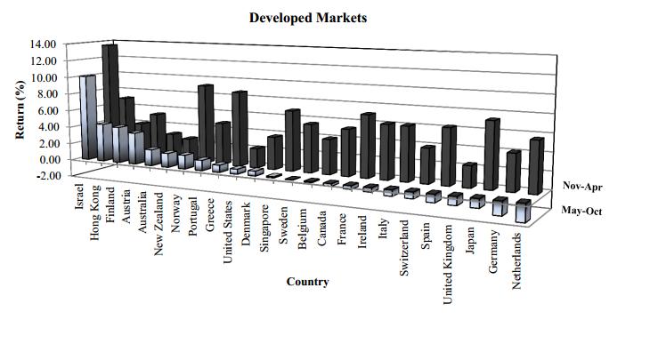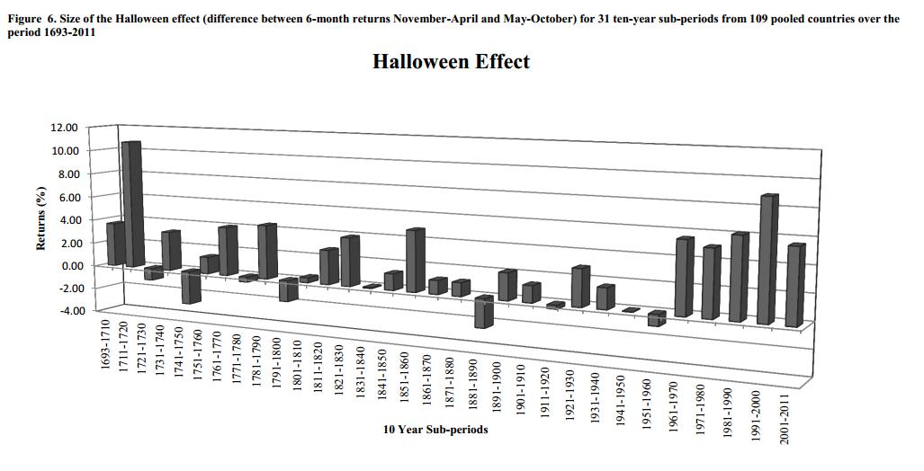 Naast de doden op Halloween rijzen ook de stieren op de aandelenmarkten op. Uit een recent academisch onderzoek blijft wereldwijd gezien dat bij vrijwel alle landen (behalve Mauritius) de beurzen gemiddeld 1,2% dalen in de periode mei-oktober (gebaseerd op 33.348 maandelijkse rendementen). Daarna treedt een herstel op. Hoewel dit effect niet altijd in alle landen opgaat is het statisch significant”, aldus onderzoeker Ben Jacobsen.
