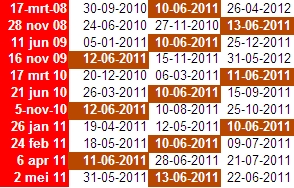 Hoe zit het met de Amerikaanse rente? Ook hier zien we een batterij aan data rondom 9-13 juni. Behalve het draaipunt op 28 januari 2011 zijn de overige data niet van grote importantie. Ongetwijfeld zal de rentemarkt gaan draaien, de vraag is alleen of dat nu al het geval is. De rente daalt al weer 2 maanden een flink stuk, dus is dit de bodem en gaan we op weg naar hogere rentetarieven?