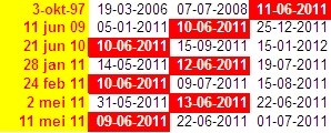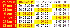Oke Elmer je zal wel gelijk hebben . Bij mn computer hangt een grafiek van dhr Armstrong uitgeprint op 4-10-2010, daarop staat bij 2011,45 de datum 6-18-2011. Ik weet niet meer hoe ik daar op ben gekomen maar je kunt deze datum ook vinden op de site : http://www.contrahour.com