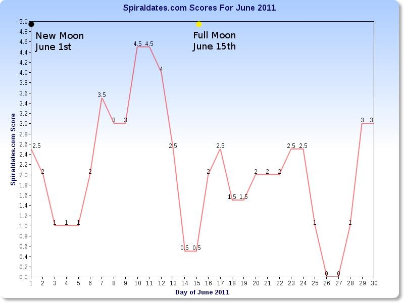 Om te beginnen de Dow Jones. Hieronder zien we de Spiraldates Scores die gebaseerd zijn op de Spiral Calendar. Hoe hoger de piek in de grafiek, hoe waarschijnlijker dat er een draaipunt is. De hoogste piek zien we bij 10-11 juni (en iets lager 12 juni en 13 juni).