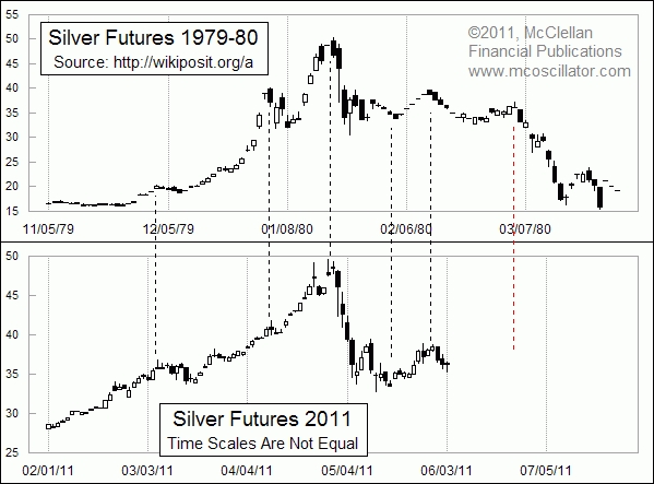 Kijken we naar de marktbewegingen van goud dan lijkt het erop dat goud nu een top maakt en rijp is voor een flinke correctie, voorzover die al niet begonnen is…. Dit lijkt bevestigd te worden wanneer we de analogie volgen van Tom McClellan tussen de zilverprijs in 1980 en nu.