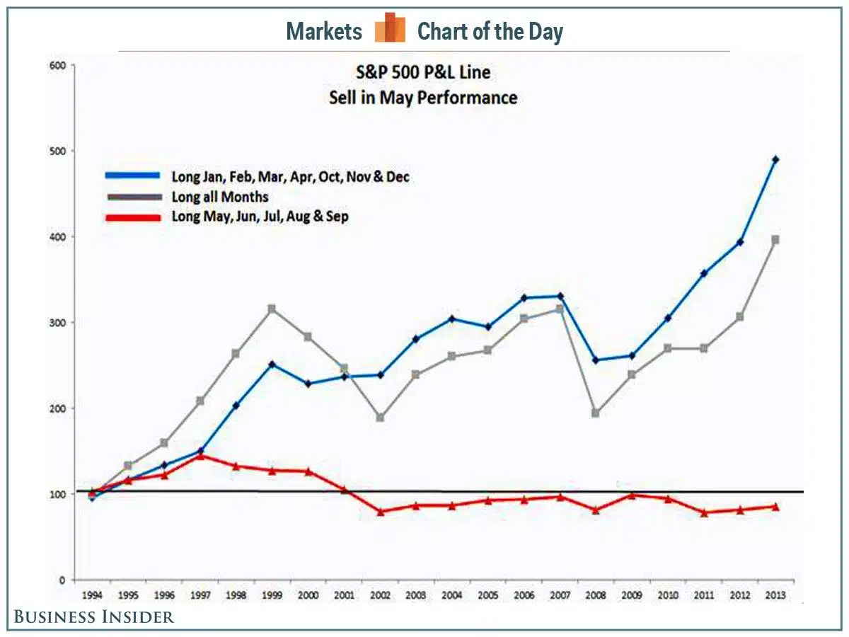 Zij onderzochten drie groepen beleggers met elk een belegging van van $1.000. De eerste groep stapte alleen in de markt in januari, februari, maart, april en in de periode oktober-december. De tweede groep zat alleen in de markt tussen mei-september en de derde groep zat altijd volbelegd. Het kapitaal van dezse laatste groep groeide aan tot $4.000 terwijl het vermogen van de eerste groei steeg naar $5.000, De tweede deed zoals de beurswijsheid het voorspelde, het slechts waarbij een negatief rendement werd gemaakt. (zie de onderstaande grafiek)