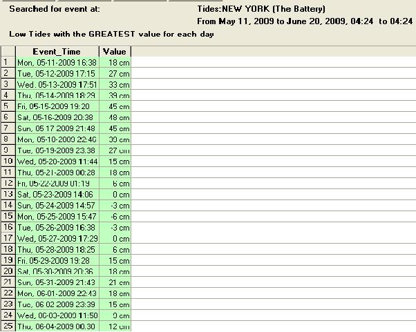 Om een top in de markt te vinden moeten we kijken naar laagtij met de grootste waarde: je ziet hieronder dat in de komende periode de hoogste laagtijwaarde op 16 mei valt (48 cm). Aan het einde van de maand, op 31 mei (21 cm) is nog zo’n dag zichtbaar.