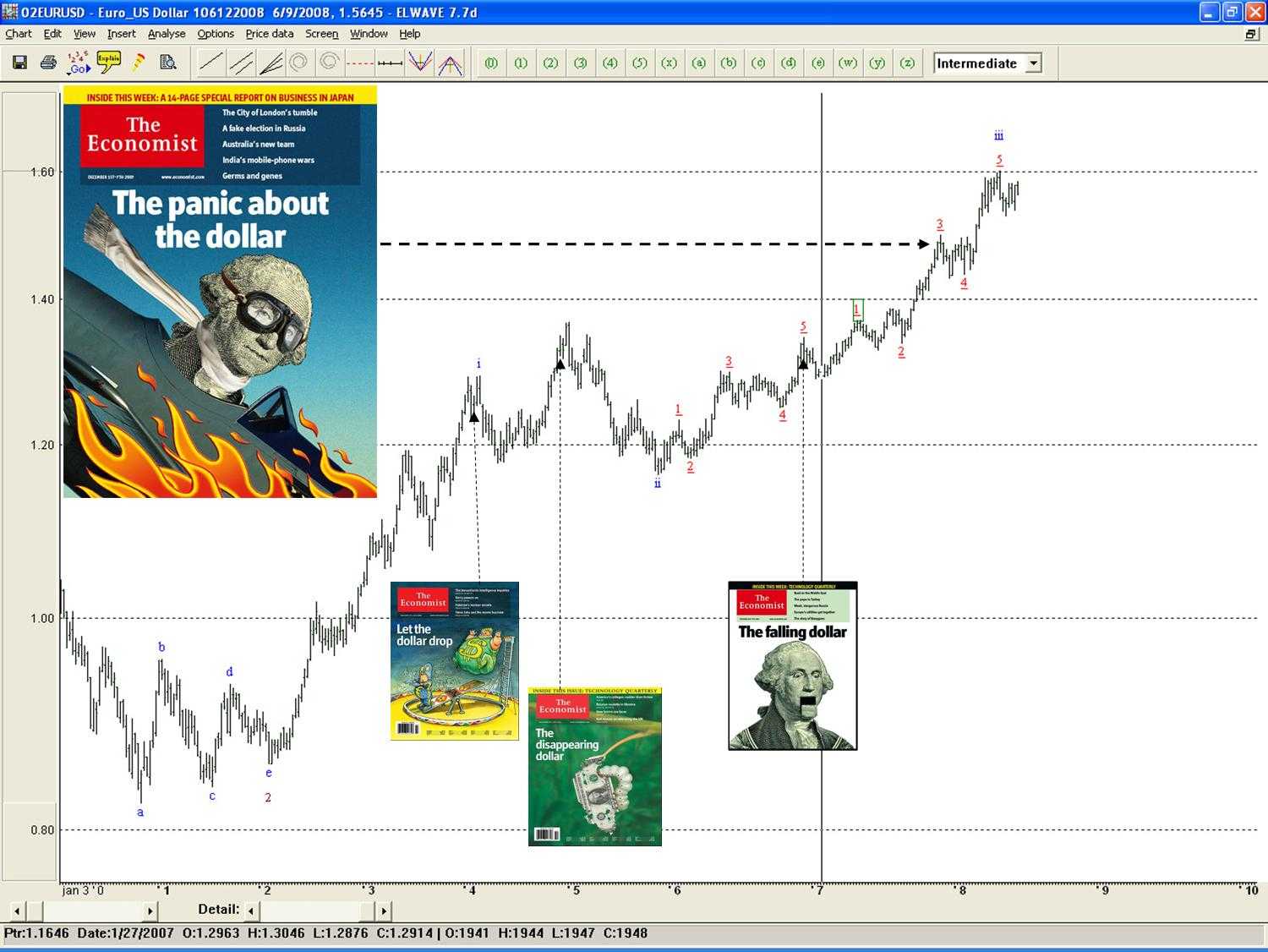 The Economist publiceert regelmatig covers die ons veel informatie verstrekken met betrekking tot de richting van de beurs, valuta e.d. Zie hieronder in de grafiek van de euro-dollar de nauwkeurigheid waarmee The Economist in staat was om toppen in de euro ten opzichte van de dollar te markeren. Iedere keer rondom een bodem (top) in de dollar (euro) van enige betekenis in de jaren 2004 tot 2007 had het magazine een cover die daarvoor ‘waarschuwde’. De koppen luidden: ‘Let the dollar drop’, ‘The disappearing dollar’, The falling dollar’ en ‘The panic about the dollar’. U ziet dat contrair denken, dus 180 graden omgekeerd, u veel meer gebracht zou hebben dan wanneer u positie had ingenomen op basis van de boodschap op de cover. Zoals gezegd, de trend is rijp, het is juist tijd voor een ommekeer.