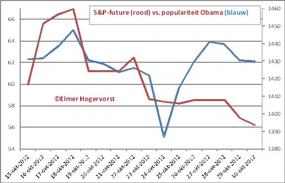 Dit naar aanleiding van mijn column van vorige week. Hieronder nog een update van de populariteit van Obama. Dit keer heb ik de populariteit afgezet tegen de Amerikaanse S&P-future, aangezien op Wall Street al twee dagen niet gehandeld wordt als gevolg van Sandy.