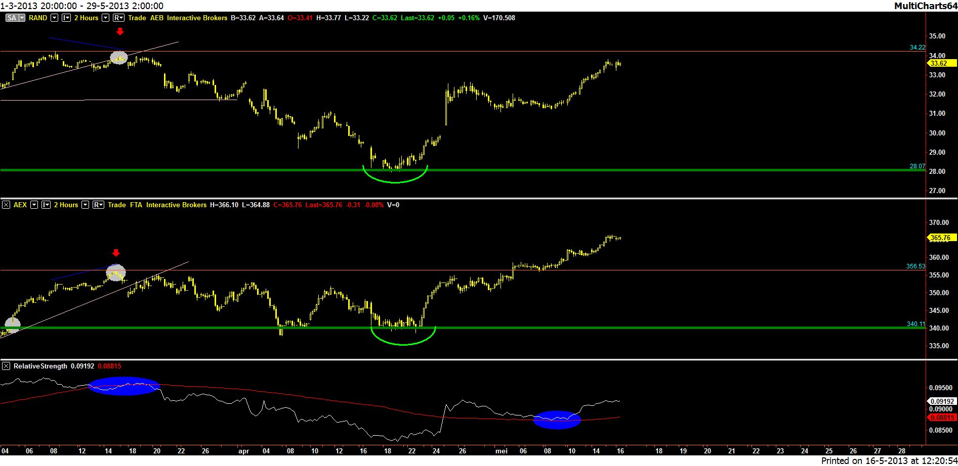 U ziet in de grafiek bovenin Randstad op 2-uursbasis, eronder de AEX en onderaan de relatieve sterkte tussen beiden. De groene steunlijnen zijn belangrijke referenties uit het verleden. Medio maart ziet u de relatieve sterkte (RS) verzwakken, waarbij Randstad een trendverzwakking laat zien. Het bleek de opmaat voor de correctie naar 28 en 340 in de AEX, waar ze beiden tegelijk bodemden!