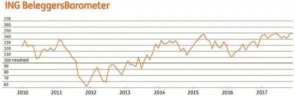 Met een even hoge score van 149 blijft de ING BeleggersBarometer deze maand stabiel én hoog, ten opzichte van de maand oktober. Beleggers houden een onveranderd positief gevoel bij de Nederlandse economie. De overgrote meerderheid van de beleggers (74%) zag de economische situatie de afgelopen drie maanden verbeteren. Bijna driekwart van de beleggers werd de afgelopen periode bovendien geconfronteerd met een waardegroei van de beleggersportefeuille. Ook voor 2018 zijn de verwachtingen van beleggers buitengewoon positief. 51 procent verwacht een waardestijging tot 5% van hun aandelen, 21 procent denkt zelfs dat hun portefeuille met meer dan 5 procent in waarde gaat groeien.