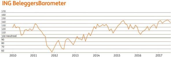 Na de piek in mei met een stand van 150 vertoont de ING BeleggersBarometer nu een licht dalende trend en komt deze maand uit op 142. Deze daling wordt veroorzaakt doordat beleggers iets minder positief zijn over de economische situatie in Nederland en de ontwikkeling van hun eigen beleggingsportefeuille van de afgelopen maanden. Ook zijn ze iets minder positief over hun portefeuille voor de komende tijd. Nu de beurzen rustig zijn, vindt de helft van de beleggers het moeilijk om hier op te acteren en doet dus niets. Beleggers geven deze maand ook nog een tip aan de formerende partijen mee. Om de economie verder te stimuleren, moeten de lonen in Nederland omhoog.