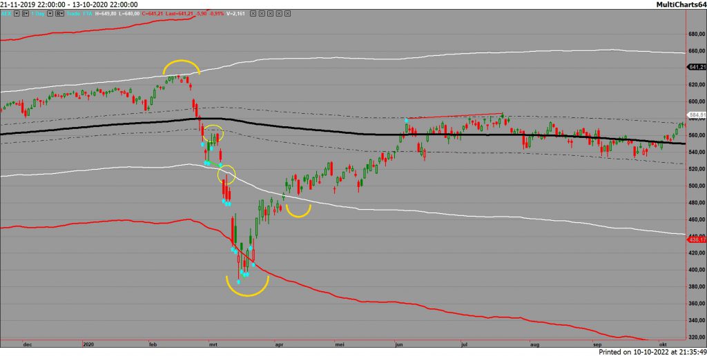 - Bearish; witte lijn wordt geraakt, aan voorwaarde van ‘fear’ is voldaan en opwaartse beweging verwacht mag worden tot…de ‘mean’ ofwel zwarte bandbreedte.