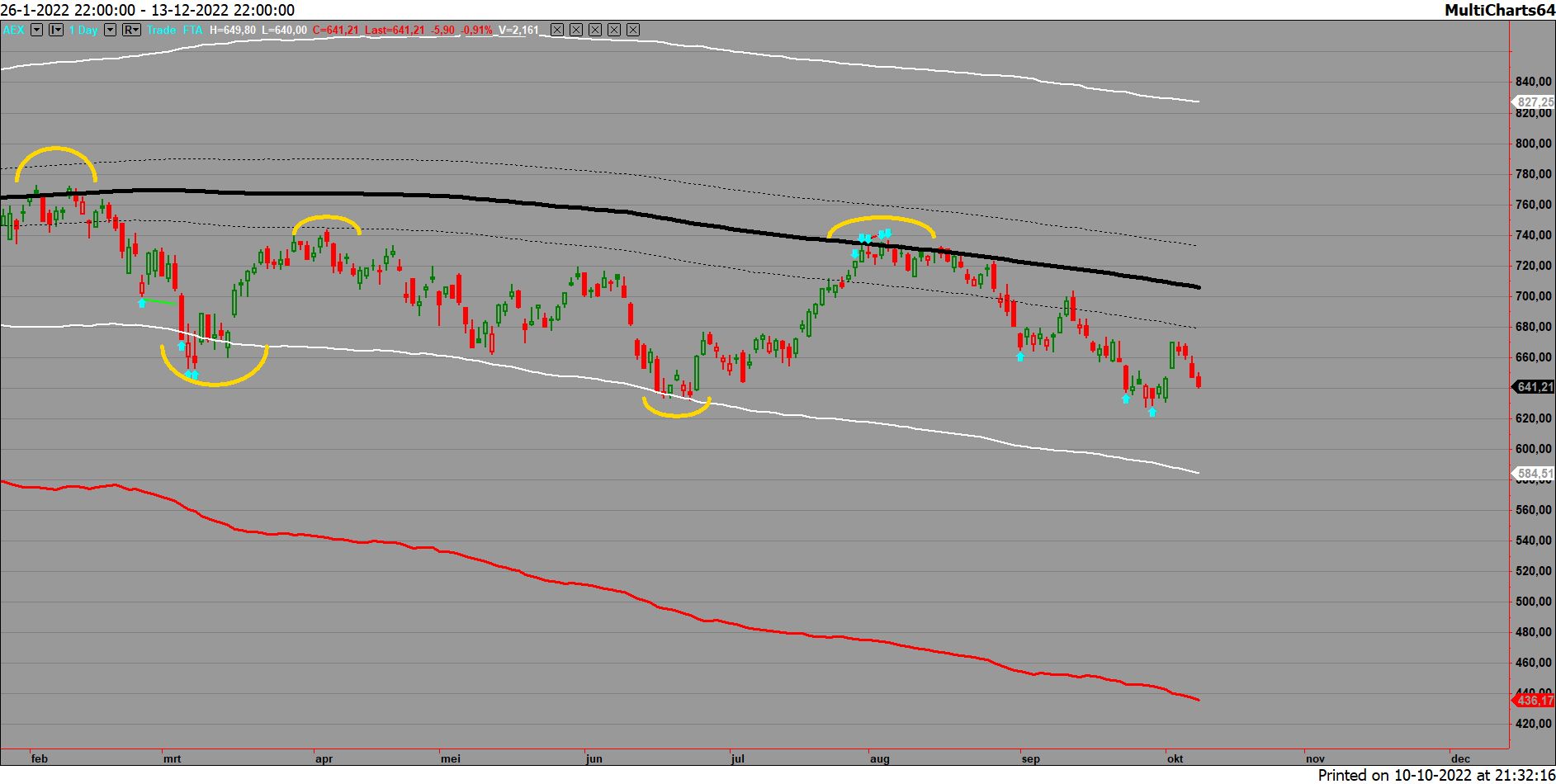 De AEX beweegt nu in fase 2 neerwaarts (tussen zwarte band en witte lijn) waarbij het koersdoel de witte lijn is, die dagelijks licht wijzigt!