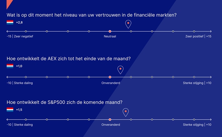 Het vertrouwen van beleggers in de financiële markten bleef in vergelijking met januari gelijk op 2,8 op een schaal van -15 tot 15. In december lag dit nog op 3,9. Het sentiment rond de AEX is daarentegen licht verslechterd. Beleggers verwachten gemiddeld een groei van 1,0% in de komende maand. Dat was de voorgaande maand nog 1,3%. De vooruitzichten voor de S&P 500 zijn bijna onveranderd gebleven: van 1,6% naar 1,5%.