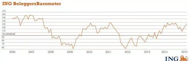 Vier op de tien zelf beleggende particulieren heeft alleen maar Nederlandse aandelen in zijn of haar portefeuille. En meer dan 60% vult meer dan de helft van de beleggingsportefeuille hiermee. De AEX is dan ook de meest populaire index om te volgen, gevolgd door de Dow Jones en de NASDAQ. Dit blijkt uit de ING BeleggersBarometer van januari 2015. Het vertrouwen in de beurs is in de eerste maand van 2015 verder gestegen: de ING BeleggersBarometer komt uit op 134, iets hoger dan de stand van 128 in december.
