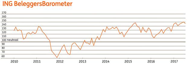 De BeleggersBarometer zakt weer iets terug ten opzichte van mei (150) naar een stand van 146. Deze lichte daling komt doordat net iets minder beleggers dan in mei hun portefeuille de afgelopen maanden zagen stijgen. Nog steeds zagen zeven op de tien beleggers het afgelopen halfjaar de waarde van hun beleggingsportefeuille wel toenemen. Nu de AEX een paar maanden boven de 500 staat, durft de belegger voor het eerst ook een voorspelling te doen die daar boven komt, namelijk 502. Beleggers hopen dat een nieuwe regering niet nog langer op zich laat wachten. De helft van de beleggers denkt dat de formatieduur nu nog geen effect heeft op de economie, maar dat dit wel gaat gebeuren als de formatie nog langer duurt.