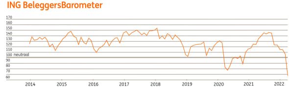 Voor veel beleggers vielen de beleggingsresultaten van de afgelopen maanden tegen: 60% zag de waarde van hun beleggingsportefeuille dalen, tegenover 38% in februari. Beleggers zien de toekomst somber in. Twee derde van de beleggers verwacht dat de economische situatie in Nederland de komende tijd verslechtert en dat dit ook de eigen financiële situatie niet ten goede komt. Bob Homan, hoofd ING Investment Office: “38% van de beleggers verwacht een verslechtering van de eigen financiële situatie. Vorige maand was dat nog 21%. Naast beursontwikkelingen begin maart, zijn ook de hoge brandstofprijzen hier debet aan.” Ook verwacht de helft dat de waarde van hun beleggingsportefeuille daalt in de komende drie maanden. De voorspelling voor de AEX-stand in juni staat nu op 669, een flink lagere voorspelling dan de 754 die vorige maand voorspeld was voor mei. Homan: “Het zal veel mensen wellicht verbazen dat de meeste aandelenbeurzen alweer hoger staan dan voordat de oorlog in Oekraïne uitbrak.”