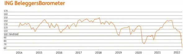 Het beleggersvertrouwen is deze maand sterk gedaald. Sinds het begin van de coronacrisis is de index niet meer zo laag geweest. Van 107 punten in februari, is de index deze maand gezakt naar 68, zo blijkt uit de ING BeleggersBarometer. De oorlog in Oekraïne is de voornaamste oorzaak van deze daling. Driekwart van de beleggers denkt dat de oorlog een grote impact zal hebben op onze economie.