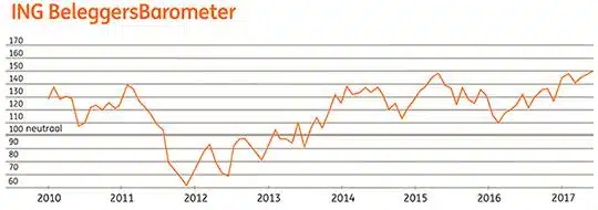 De BeleggersBarometer gaat deze maand door de grens van 150 punten en bereikt daarmee de hoogste score sinds 10 jaar. De lichte stijging ten opzichte van vorige maand komt vooral door een stijging van het aantal beleggers (81%) dat de Nederlandse economie de afgelopen drie maanden zag verbeteren. Ook over de eigen financiële situatie en de waarde van de beleggingsportefeuille blijft men onverminderd positief. De stand van de AEX is behoorlijk opgelopen, maar de belegger durft nog steeds geen stand boven de 500 over drie maanden te voorspellen. De helft van de beleggers is van mening dat het beursjaar (veel) beter is dan verwacht.