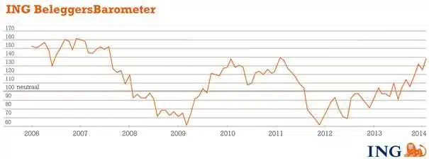 Na een klein stapje terug naar 126 in december, schiet de ING BeleggersBarometer in januari weer omhoog. Ondanks dat de afgelopen weken de beurzen flink daalden, lijkt het geloof in een goed beursklimaat stevig. Beleggers zijn vooral positief over de economie van de afgelopen drie maanden en over hun beleggingsportefeuille. Ook hun verwachtingen over de eigen financiële situatie en de beleggingen voor de komende drie maanden zijn positiever dan een maand geleden. De economische groei is voor een ruime meerderheid de belangrijkste indicator voor de hoogte van aandelenkoersen. En iets meer dan de helft van particuliere beleggers heeft goede beleggingsvoornemens voor 2014, van meer of minder risico nemen tot actiever beleggen.