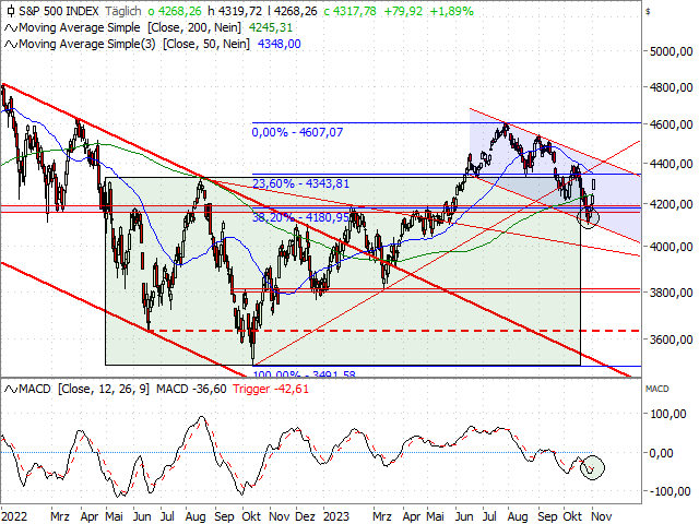 Naast de mogelijk te negatieve stemming, geeft ook de grafiek hoop. De S&P 500 heeft onlangs de bocht genomen op basis van de absolute sleutelondersteuning van de 38-maandenlijn en de opwaartse trend sinds 2011 (momenteel bij 4.152/4.150 punten). In het dagelijkse bereik gaat de beschreven ontwikkeling gepaard met een valse uitbraak onder de steunzone rond de 4.200 punten. Hier wordt het interessant, want een oude handelswijsheid luidt: “valse uitbraken worden gevolgd door snelle bewegingen”!