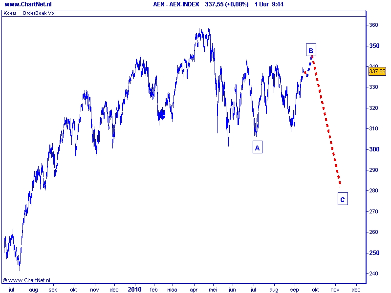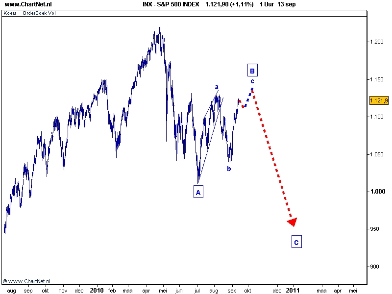 De stijging van de afgelopen tijd heeft alle kenmerken van een C golf, de consequentie van een en ander is dat we nog een felle daling mogen verwachten de komende weken. Voor de korte termijn is er echter nog wel ruimte voor verdere stijging. Voor de AEX zou een stijging tot 345 perfect in het plaatje passen. Voor de S&P 500 is een stijging tot het gebied 1135-1145 mogelijk.