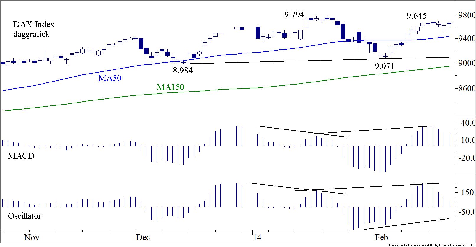 De markt is zeer verward. Er is geen overeenstemming tussen Amerika en Europa, maar er is ook geen duidelijkheid over wat de grafieken laten zien. Althans dit laatste geldt zeker voor Europa. Wij plaatsen hieronder de daggrafiek van de Duitse DAX Index waarop de verwarring duidelijk te zien is.