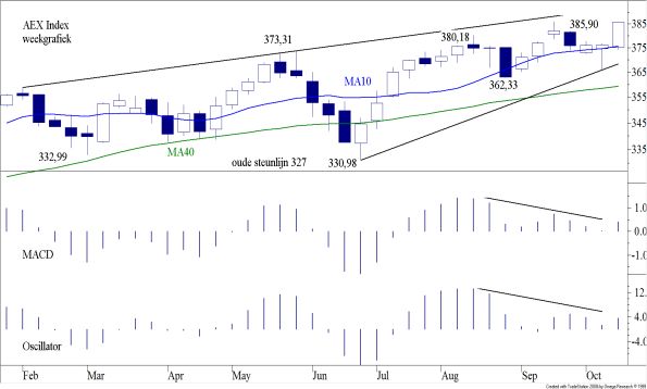 Het beste nieuws van deze week is dat het volume weer terug is. Nu alle wereldproblemen geheel of gedeeltelijk lijken te zijn opgelost gelooft het publiek blijkbaar weer in de beurs. En dat is eigenlijk het beste nieuws dat er zijn kan. Er zijn in Europa geen negatieve feiten te vermelden. Technisch gezien zijn alle indicatoren positief. Alleen in Amerika blijft het maandprofiel nog achter. Men wacht hier nog op stijgende indicatoren. Ook de New Highs blijven achter maar tezamen genomen met de New Lows (die er bijna niet zijn) is de indicator positief. Ter illustratie laten wij u hieronder de weekgrafiek van de AEX Index zien.