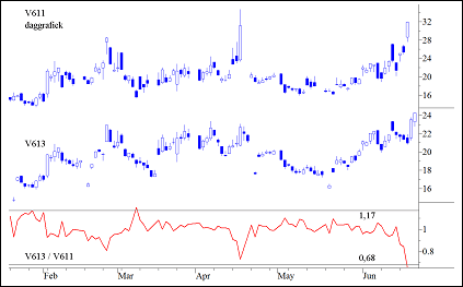 Wij laten hieronder een grafiek zien van de V613 en V611. Het zijn de drie- en één-maand volatiliteitindexen op de Stoxx50.