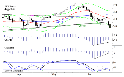 De eerdere door ons gesignaleerde koopsignalen zijn met het cijfer 1 respectievelijk 2 aangeduid. Een derde koopsignaal (doorgaans het laatste) ontbreekt nog, maar dat zal heel zeker komen. Het eerste koopsignaal ontstond na een doorbraak door de steun die het MA50 gaf. Het tweede ontstond na de doorbraak door het MA200. Het derde is er nog niet, maar de Momentum Analyse divergeert duidelijk positief (zij het dat hij nog dalende is en de divergentie daarmee nog kan worden opgeheven) en dat is een indicatie, dat het einde van de huidige daling in zicht is. De Stochastics daarboven confirmeert deze stelling. Maar in andere markten is het niet zo duidelijk. In het algemeen bevestigt het MACD de daling niet maar de Oscillator doet dit wel. Een trend die aanwezig is blijft in takt tot het tegendeel bewezen is. De MACD heeft dus gelijk en de divergentie blijft positief zolang hijzelf de daling niet bevestigt. Andere indicatoren inclusief de sentiment indicatoren zijn (nog) niet positief. Waarom wij blijven stellen, dat de opleving, die zich aankondigt, beperkt in kracht zal zijn, is het feit dat de hogere timeframes dalend zijn en ook negatief divergerend. Schreven wij vorige week nog dat het misschien wat vroeg was om te concluderen dat de maand dalend was, dan kan men dit argument deze week niet meer gebruiken. De maand heeft zijn daling overal ingezet en dat betekent dat de markt zich grosso modo in de komende maanden zwak zal gedragen. Het is mogelijk dat er een consoliderende fase volgt maar een stijgende fase moet u (behalve voor de zeer korte termijn) uit uw hoofd zetten. In de grafiek vindt u (opnieuw slechts voor de korte termijn) de steunniveaus. Op dit moment ligt de koers op de steun van 337 te geven door de top uit april van dit jaar. Iets verder terug vindt men 332 en tot slot vermelden wij de zeer oude steunlijn, die reeds vaak dienst heeft gedaan op 327.