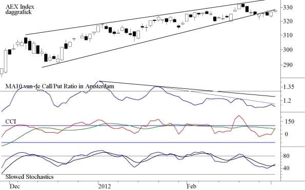 Er is geen discussie over de vraag of de AEX Index zich al sinds het einde van het vorige jaar in een opwaartse trend bevindt. Maar inmiddels lijken de koersen wel uit hun stijgende wedge te zijn gevallen. Onder de grafiek van de AEX Index ziet u de Call/Put Ratio, althans een 10-daags Voortschrijdend Gemiddelde daarvan. Dit gemiddelde heeft de opgaande beweging aanvankelijk goed gevolgd, maar na de top van januari heeft zich een daling ingezet en sindsdien is er sprake van negatieve divergentie.