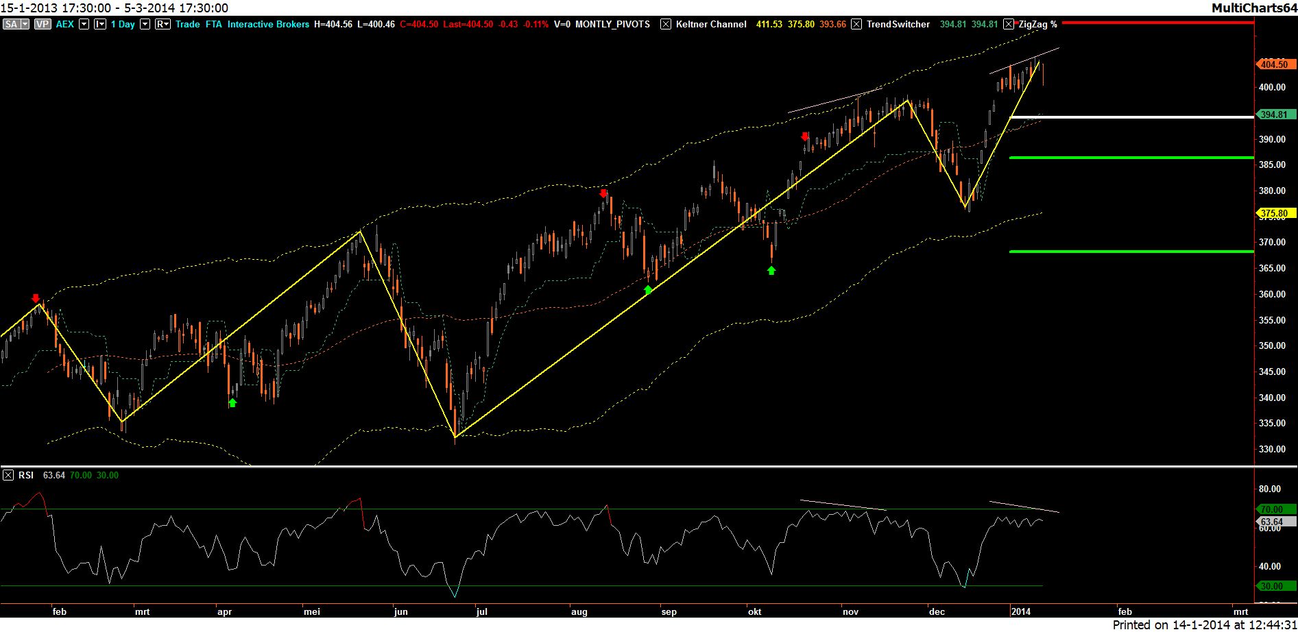 We zien nu vermoeidheidsverschijnselen optreden bij veel indices wat een reactie in ieder geval uitlokt op korte termijn. De AEX beweegt in speelveld 394 en 412 waarbij ik persoonlijk denk aan een winstneem/ short-scenario op sterkte richting die 412. Time will tell!