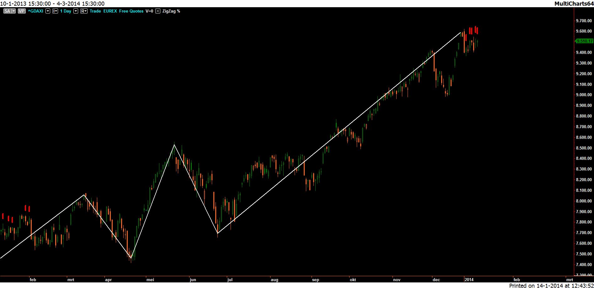 Het verschil qua implicatie scenario tussen scenario 1 (HIGH van de 1e week van december 2013 en breken 1775) en scenario 2 (de mogelijke breuk van 1775 na de hogere top erna) zit em er in dat in het 1e scenario een daling spot on was en fors mocht worden. Nu is dit lang niet meer zo zeker. Dit verschijnsel is overigens geen absolute waarheid helaas, het vormt het uitgangspunt van denken alleen.