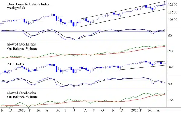 In de figuur hieronder waarin wij de AEX Index op weekbasis vergelijken met de Dow Jones Industrials Index (DJIA) is het opvallend dat de AEX Index het eigenlijk helemaal niet zo slecht deed in de periode die getoond wordt. Maar sinds de laatste bodem in de Slowed Stochastics, die bij de AEX Index al duidelijk dieper kwam, is de klad erin gekomen. Er springen twee dingen duidelijk in het oog.