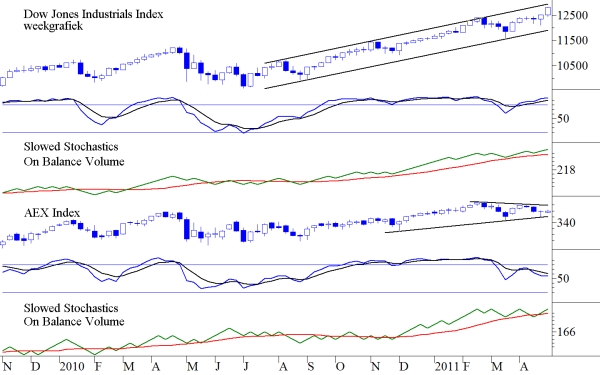 De DJIA ligt aan de bovenkant van zijn stijgend kanaal. De weg die gegaan wordt zal naar alle waarschijnlijkheid naar de onderkant van het kanaal zijn. De AEX Index kan nog een paar puntjes stijgen maar daarna zal hij (in principe) aan de onderkant van de driehoek uitbreken. De DJIA zou zijn daling kunnen beperken tot de onderzijde van het kanaal (circa 900 punten), de AEX Index krijgt bij uitbraak een doel van circa 320, dat is toch een daling van ruim 10%. Het is natuurlijk geen wet van Meden en Perzen dat een doel bereikt wordt, noch dat een driehoek aan de onderkant wordt uitgebroken.