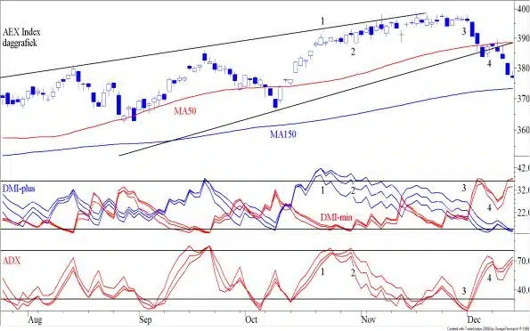 Ons verhaal begint op 22 oktober van dit jaar. In de grafiek hebben we dit aangeduid met 1. De DMI-plus (blauwe lijnen in de middelste grafiek) topt die dag. Dat wil zeggen dat vanaf 22 oktober de achtereenvolgende toppen minder stijgen dan hun voorganger. Die dag zet de consolidatie in. Bij 2 bodemt de DMI-min. De markt wordt vanaf die dag moeilijker want de afstanden tussen de bodems worden groter. De ADX zet die dag een top en dat betekent dat de trend zich wijzigde. Deze top ligt echter (te) laag om ons echte zorgen te baren. De consolidatie zet zich voort. Bij 3 kruisen de DMI-plus en de DMI-min. Voor velen is dit een sein om verkooporders in te leggen. De ADX maakt een diepe bodem en de lijnen liggen dicht bij elkaar. Dit is een serieus signaal. De markt gaat een reactie in. En zoals u in het bovenste deel van de figuur ziet laat, deze niet lang op zich wachten. De rustfase is voorbij. De markt daalt. Bij 4 vormt zich een bodem in de koersen (vorige week) De blauwe lijnen in het middelste deel gaan stijgen, maar ze liggen ver van elkaar. De ADX onderin zet een lage top neer, ook met ver van elkaar liggende lijnen. Die zegt daarmee dat er geen sprake is van een duidelijke trend. Dit betekent ook, dat er van een draai sprake kan zijn, maar het signaal is niet overtuigend (zie ook het signaal van de nog niet gekruiste Stochastics van vorige week). Zeer snel daarna dalen de blauwe lijnen weer en stijgen de rode.