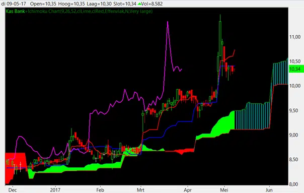 Het aandeel consolideerde vervolgens boven dit niveau. Een koopsignaal, zijnde een ‘golden cross’, werd al in maart gegeven: het korte voortschrijdende gemiddelde Tenkan Sen-lijn (rood) kruiste de Kinjun Sen-lijn (blauw) opwaarts.