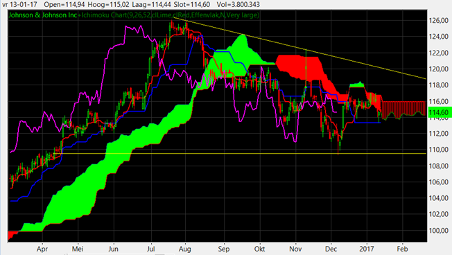 We zijn niet alleen fundamenteel, maar ook technisch positief gestemd ten aanzien van het aandeel. Onlangs hebben we voor de recent gelanceerde Dividend Rendement Aandelen Portefeuille een positie op Johnson & Johnson ingenomen via een geschreven put.
