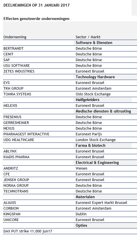 We hebben aandelen van het de Belgische durfkapitalist Quest for Growth opgenomen. Wij denken dat dit Belgische fonds interessant is, onder meer vanwege de brede spreiding van de portfolio waarin het belegt (zie onderstaande tabel). De trade luidde als volgt: