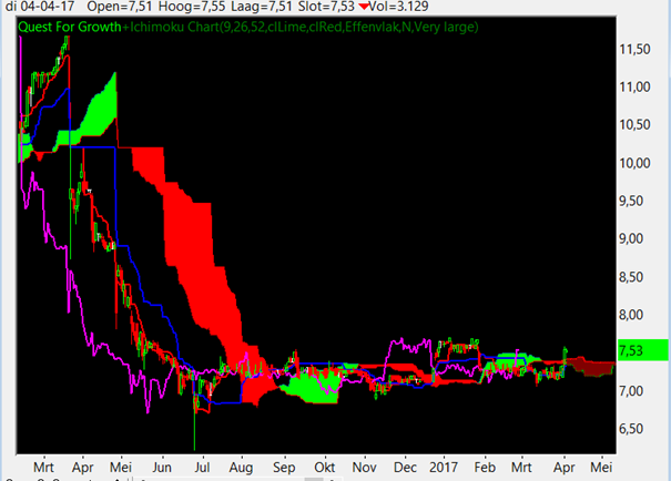 De koers van Quest for Growth is in 1 jaar tijd bijna gehalveerd en bereikte daarbij eind juni vorig jaar een dieptepunt van €6,22. Het aandeel consolideerde vervolgens maandenlang en heeft sinds kort de weg omhoog weer gevonden. Een koopsignaal, zijnde een ‘golden cross’-signaal, is op dagbasis al gegeven: de voortschrijdende gemiddelden Tenkan Sen-lijn (rood) en de Kinjun Sen-lijn (blauw) hebben elkaar onlangs gekruist.