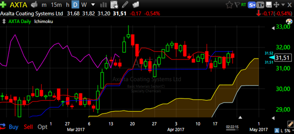 Op bovenstaande dagchart is de opwaartse trend van AXTA duidelijk te zien en werd er al begin dit jaar een zogenoemd ‘golden cross’-koopsignaal gegeven: de voortschrijdende gemiddelden Tenkan Sen-lijn (rood) en de Kinjun Sen-lijn (blauw) hebben elkaar gekruist.