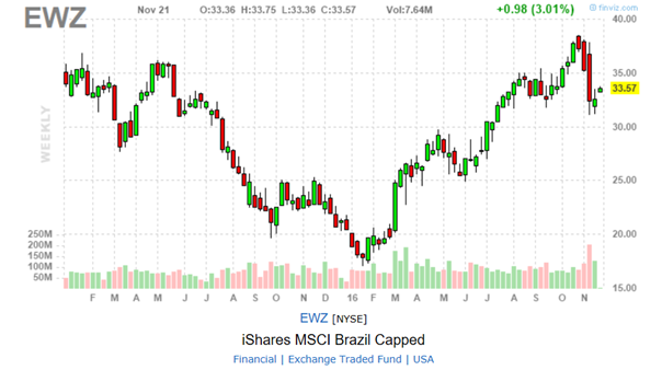 EWZ werd in juli 2000 gelanceerd en is een speculatief ETF dat de Braziliaanse aandelenmarkt volgt. In dit ETF wordt veel gehandeld: gemiddeld circa 22 miljoen ‘stukken’ per dag.
