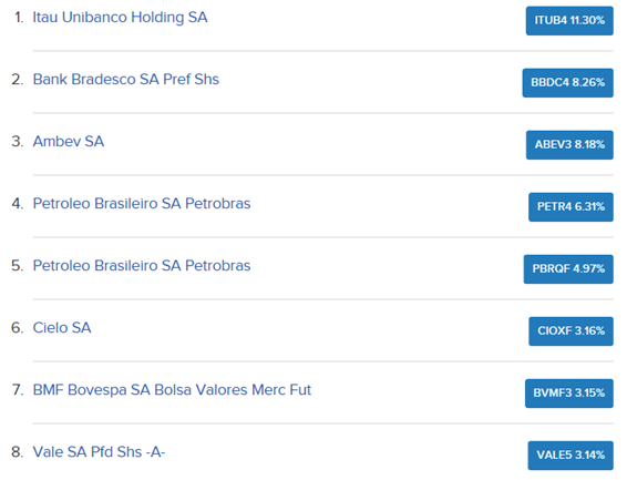 Onderstaande tabel geeft de Top 8-holdings aan die in dit ETF zitten. Zo zijn bierbrouwer AMBEV, oliemaatschappij Petrobras, beursuitbater Bovespa en mijnbouwfonds Vale bekende namen: