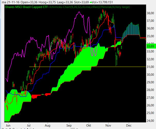 De koers van EWZ is sinds de uitslag van de Amerikaanse presidentsverkiezingen begin november aanzienlijk gedaald. Het ‘Trump-effect’ heeft tot een duidelijke schok geleid op de ‘Emerging Markets’. Brazilië is ook een belangrijke opkomende markt. EWZ daalde in slechts een paar dagen tijd zo’n 20%. De val werd rond $31 gestuit waarna er een sterk herstel optrad. EWZ kent een brede trading range met $31 als steunzone aan de onderkant en een weerstandsniveau van $38,50 als bovenkant.