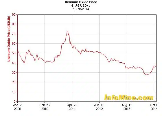 Na de kernramp in Fukushima is de elektriciteitsproductie door middel van kernenergie met 16% gedaald. Een gematigd herstel wordt verwacht nu twee reactoren in Japan weer in bedrijf worden genomen. Volgens het Australische Bureau of Resources and Energy Economics (BREE) wordt een herstel van de uraniumprijs verwacht als gevolg van een hogere consumptie zowel in Japan als in China. Het onderzoeksbureau voorziet een uraniumprijs van gemiddeld $39,50 in 2015. Dat is een stijging van 23% ten opzichte van dit jaar. De opmars zal in de komende jaren doorzetten en de BREE verwacht een uraniumprijs van ongeveer $62 in 2019 op de borden! Dat zou een volledig herstel betekenen van de daling na de kernramp.