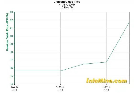 De urianiumprijs gaat door het dak. Na een periode van bijna vier jaar mogen twee reactoren van Japan volgend jaar weer in bedrijf worden genomen. De reactoren in de Sendai Nuclear Power Plant zijn slechts twee van de 48 in Japan die hun deuren moesten sluiten na de kernramp in Fukushima in 2011. Op 11 november werd de nieuwste prijs bekendgemaakt: op 41,75 USD/pond (!), een stijging van maar liefst 5 USD oftewel +13,6% week-op-week!