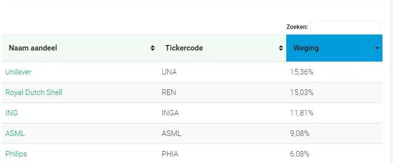 Deze vijf fondsen maken qua weging meer de helft uit van de Nederlandse beursgraadmeter.