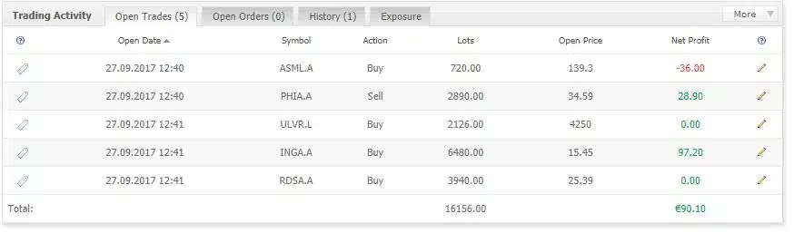 Nieuw ! We zijn gestart met trading op de AEX-top 5. Ditmaal gaan we automatisch handelen. Wij gaan inspelen op marktbewegingen van de vijf grootste beursfondsen, zowel long als short. Dus we kunnen ook profiteren van een daling van de beurskoersen. Markten zullen immers niet altijd stijgen. Wij kiezen voor de vijf grootste beursfondsen vanwege de transparantie en liquiditeit. Het gaat om Royal Dutch Shell, Unilever, ING, ASML en Philips.