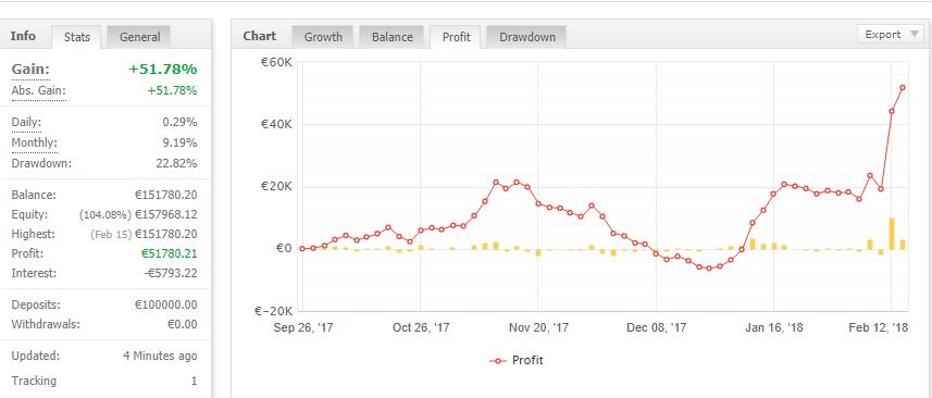 Sinds de start op 27 september 2017 bedraagt het gesloten resultaat 51,8% oftewel € 51.780. Er wordt gewerkt met een systeem op basis van een algoritme die de aan-en verkoopsignalen afgeeft.