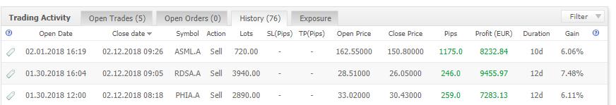 Zo werd short gegaan op Shell op € 28,51 en de positie werd gesloten op € 26,05, een winst van 7,48%.