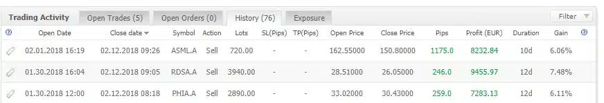 Zo werd short gegaan op Shell op € 28,51 en de positie werd gesloten op € 26,05, een winst van 7,48%.