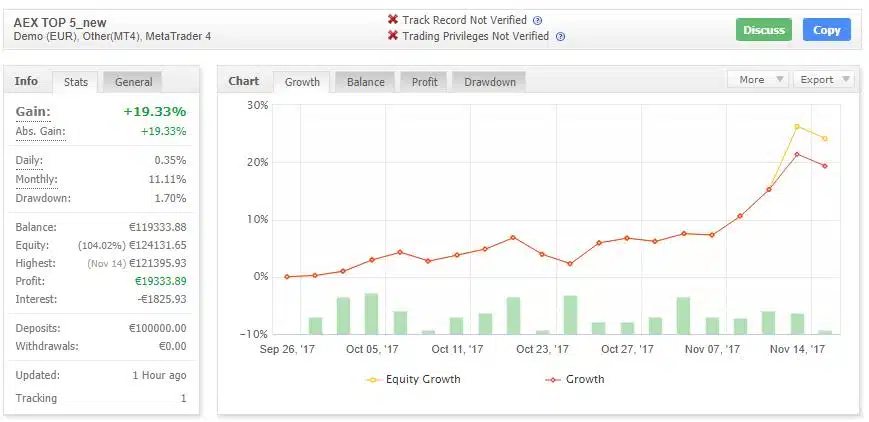 De AEX top-5 staat na de start op 27 september op een winst van 19,3% ! We zijn gestart met trading op de AEX-top 5. Ditmaal gaan we automatisch handelen. Wij gaan inspelen op marktbewegingen van de vijf grootste beursfondsen, zowel long als short. Dus we kunnen ook profiteren van een daling van de beurskoersen. Markten zullen immers niet altijd stijgen. Wij kiezen voor de vijf grootste beursfondsen vanwege de transparantie en liquiditeit. Het gaat om Royal Dutch Shell, Unilever, ING, ASML en Philips. Deze vijf fondsen maken qua weging meer de helft uit van de Nederlandse beursgraadmeter.